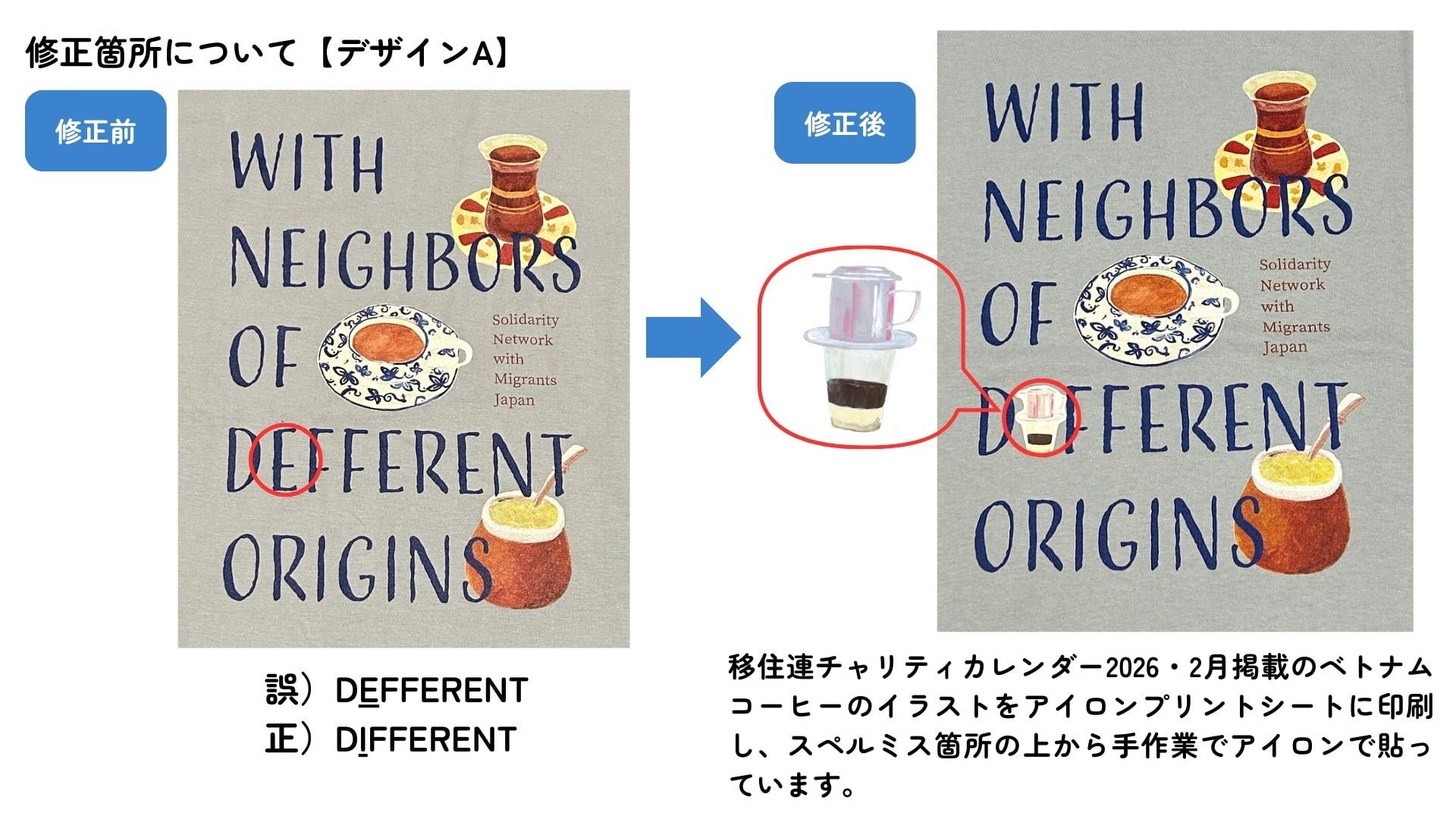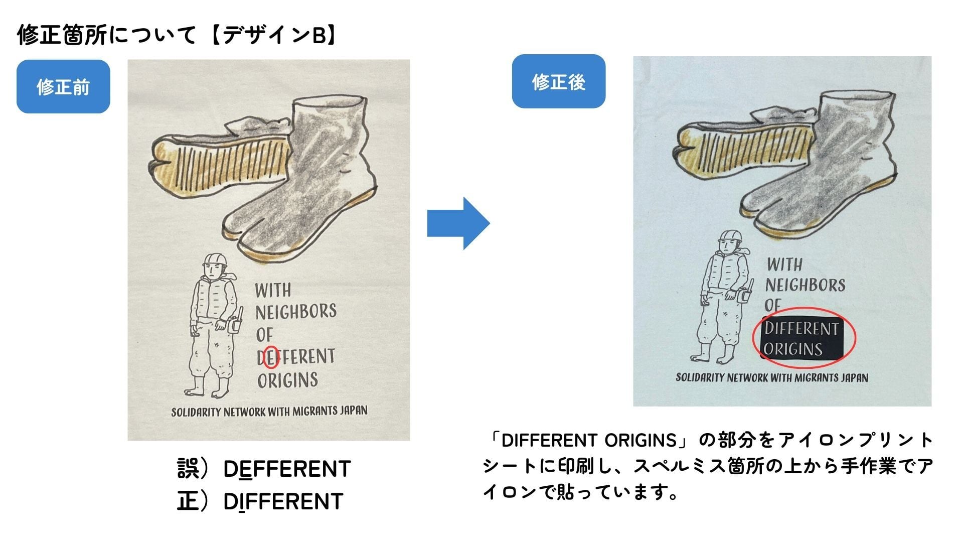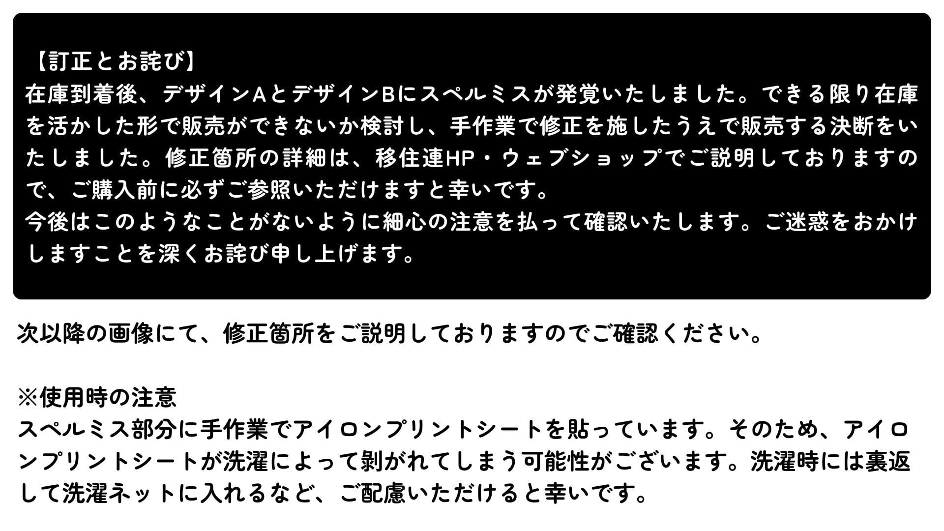 在庫到着後、デザインAとデザインBにスペルミスが発覚いたしました。できる限り在庫を活かした形で販売ができないか検討し、手作業で修正を施したうえで販売する決断をいたしました。修正箇所の詳細は、画像でご説明しておりますので、ご購入前に必ずご参照いただけますと幸いです。
