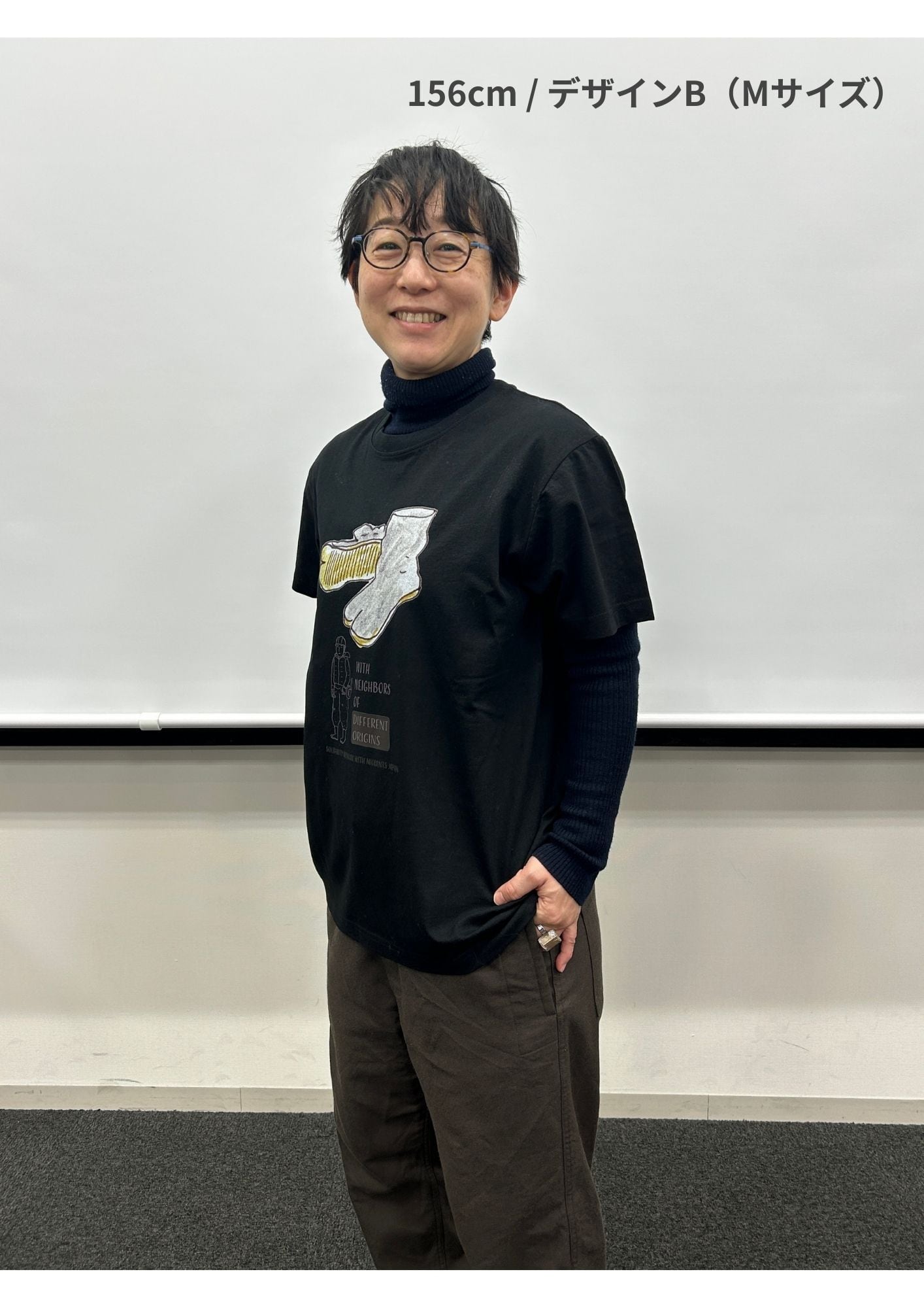 文筆家・イラストレーターで、「難民・移民フェス」実行委員でもある金井真紀さんからイラストを提供いただきました。日本に暮らすさまざまなルーツの人びとの日常のひとコマが、やさしいタッチで描かれています。身につけることで、隣人とともに生きる社会をそっと応援できる一枚です。